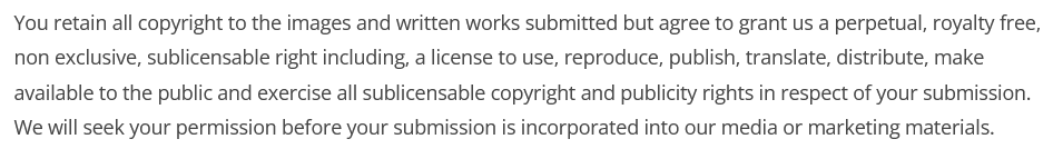 As a creative person, you can find many websites that offer help in the form of submissions for prizes, awards, publications, etc. Sometimes companies claim a perpetual sublicense of an artists’ works. Here’s an example: